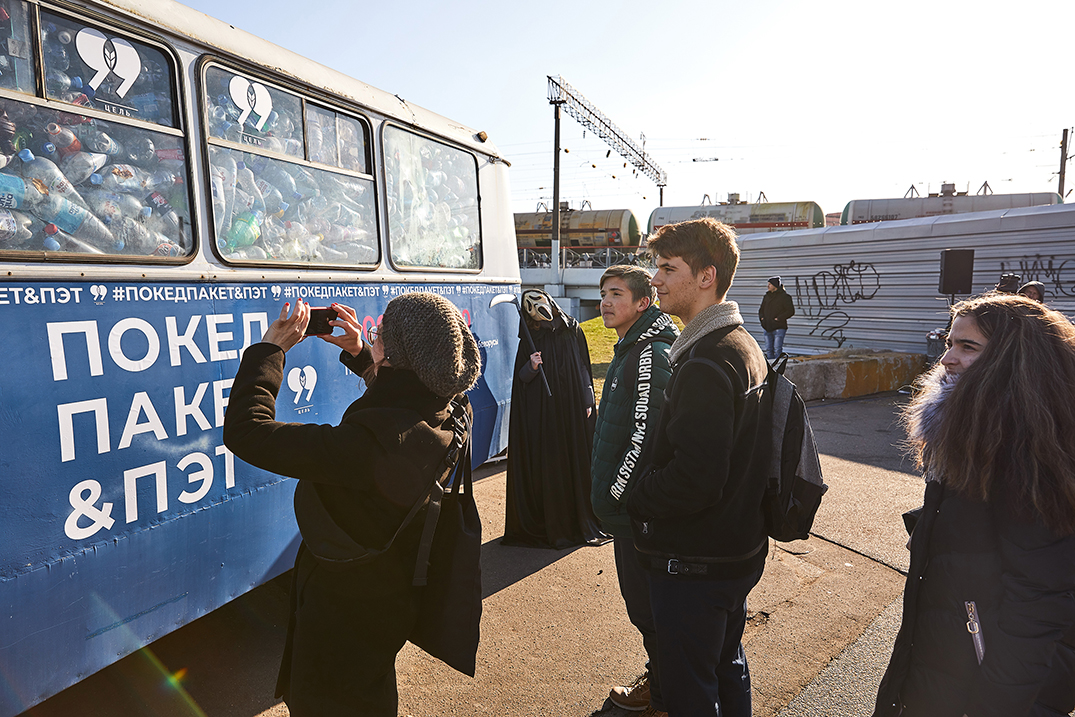 31 октября на улице Октябрьской припарковался автобус, битком наполненный ПЭТ-бутылками. 20 тысяч бутылок — столько пластика выбрасывает тусовочная улица за неделю. Хоррор-автобус стоял