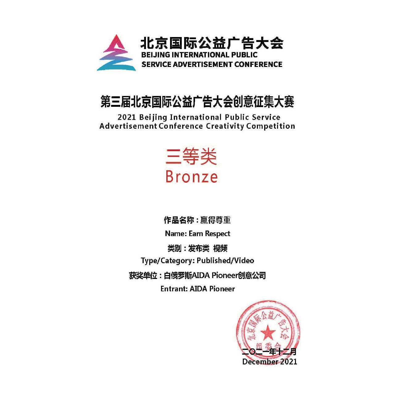 Рекламная кампания по продвижению правильной утилизации старой бытовой техники «Заработай уважение» государственного учреждения «Оператор вторичных материальных ресурсов» отмечена международной наградой на конференции в Пекине. Мероприятие проходило в декабре 2021 года под эгидой Народного правительства Пекина и Национального управления радио и телевидения Китая. 3-я Пекинская международная конференция по рекламе была сфокусирована на общественно значимых рекламных проектах, социальной рекламе. Форум собрал представителей рекламной индустрии из 10 стран. Всего на рассмотрение жюри поступило более 5 тысяч заявок. Премиями были отмечены 507 работ, белорусская социальная реклама «Заработай уважение» получила бронзовую награду.